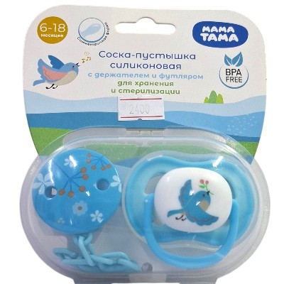 Соска-пустышка МАМА ТАМА симметричная силиконовая 6-18 мес., с держателем, цвет: голубой, арт МТ/108